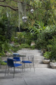 A favourite of the gardens presented is in Redfern. When designing a garden in a small space the design mantra is usually about restraint. But here the client demanded abundance and so there is a fabulous textural interplay of mostly green-foliaged, insignificantly-flowering plants, backed by a wall of mirror that both reflects light back into the west-facing space and visually extends the sense of green enclosure. It’s not just the disco balls hanging from the branches of a mature tree that make this feel like a fun place to hang out.